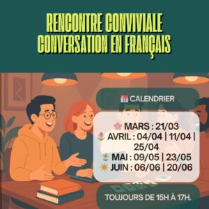 Des échanges informels pour pratiquer le français sans stress, des jeux de groupe pour faciliter les présentations, des discussions sur la vie en France, le tout accompagné d’une collation conviviale.