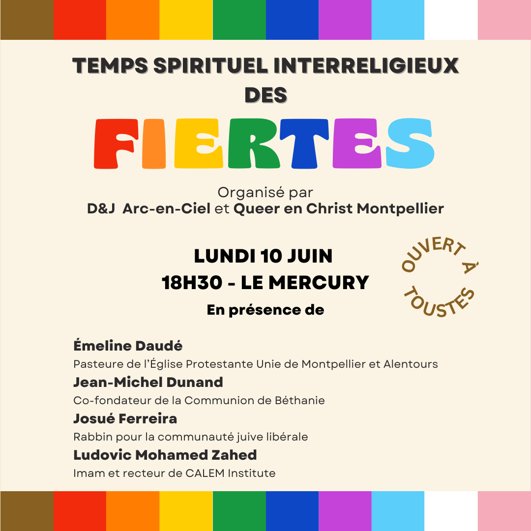 LGBTQIA+ croyant-e-s, en recherche, curieux/curieuses ou allié-e-s, vous êtes tou-te-s invité-e-s au bar Le Mercury (26 rue des écoles laïques, Montpellier) ce lundi 10 juin à 18h30 pour partager ce temps interreligieux, inclusif et intersectionnel !